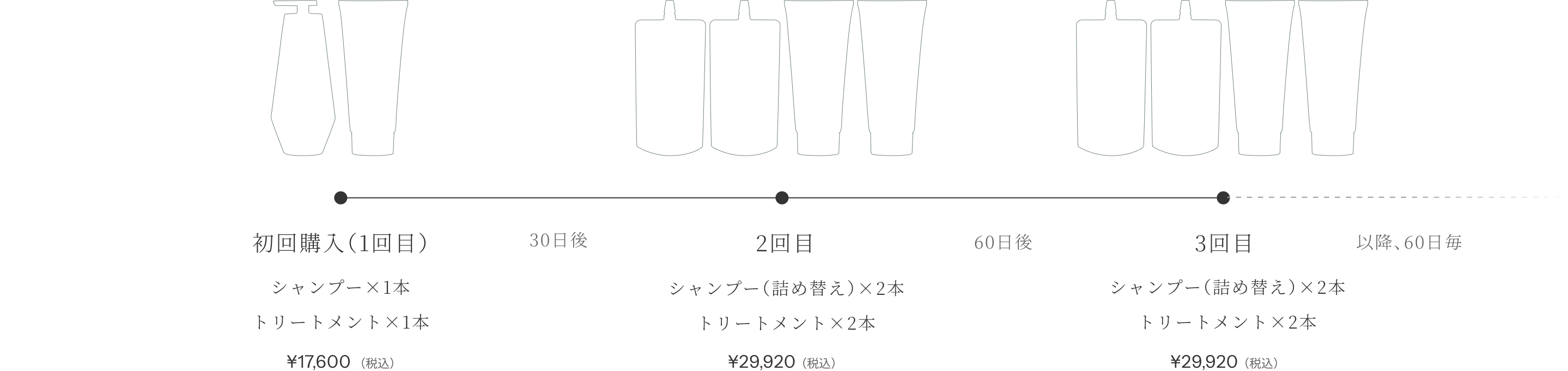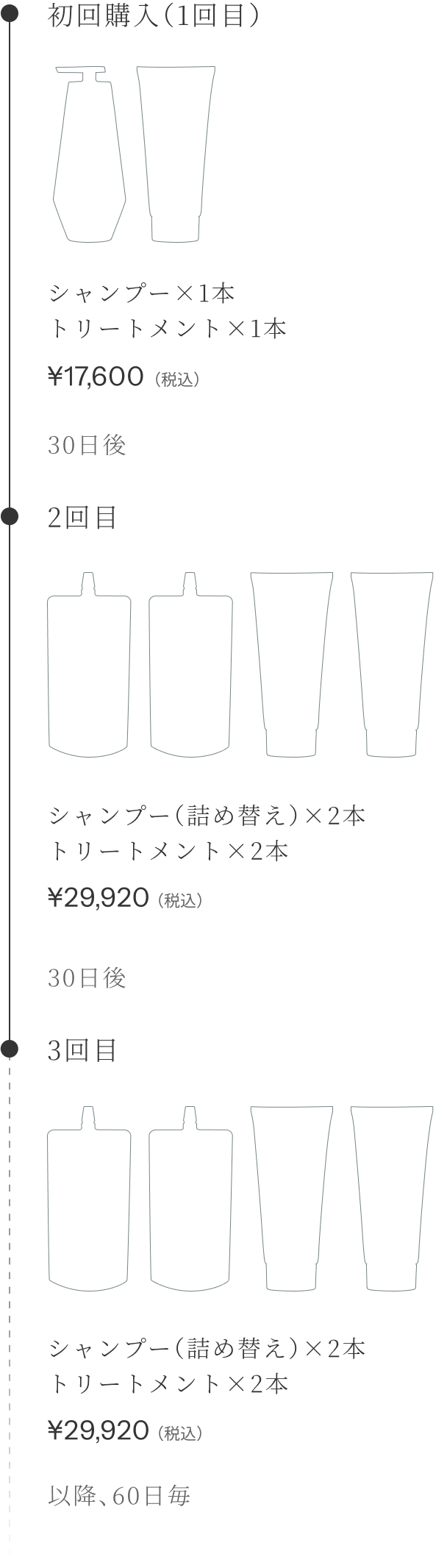 ムダなくストックを切らさないことを基準に、定期便をお届けします。初回は届いてすぐ使えるボトル入り。2回目は、詰め替えを2回分お届けすることで、今使う分と予備を常に手元に。以降は2回分を60日ごとにまとめてお届けし、急なストック切れとプラスチック梱包材を減らすことで環境への負荷を防ぎます。